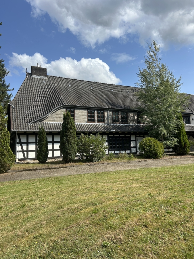 Im vorderen Grundstücksbereich befinden sich das Haupthaus mit Erdgeschoss und Obergeschoss, circa 600 m², sowie ca. 300 m² Keller und ca. 150 m² Ausbaureserve im Dachgeschoss sowie das Nebengebäude.